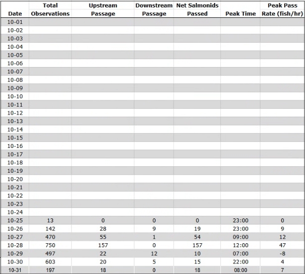 | Date | Observations | Right/ Upstream Passage | Left/ Downstream Passage | Net Salmonids Passed | Peak Time | Peak Pass Rate (fish/hr) |